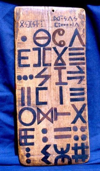 Je me rappelle encore du choc qui a bouleversé la population à Imtghren lorsque plusieurs centaines d’affiches reproduisant un de mes tableaux sont accrochées aux murs de la ville (Tableau 1). Je n’arrive toujours pas à oublier les réactions des militants lors de l’exposition de plusieurs de mes tableaux lors des années 2000 et 2001. Les tableaux "Tudert n Imazighen tulid s idamen" (Tableau 2) ainsi qu’une autre ardoise sur la quelle j’ai écrit l’alphabet Tifinagh (Tableau 3). Cette œuvre est un choc visuel et une prise de position contre l’arabisation et l’islamisation. Je suis conscient que sans choc, il ne peut y avoir d’art. Si une forme d’art n’est pas capable de dérouter le spectateur et ne bouleverse pas sa façon de penser, ce n’est pas une forme artistique pour aujourd’hui. Avant ça et précisément le 26 juin 1998, juste après l’assassinat du grand chanteur berbère Matoub Lounès, j’ai fait de mon propre corps un matériau pour la création de l’œuvre que j’ai intitulée : "Le sang qu’a versé Matoub n’aura pas coulé pour rien". (Tableau 4) J’ai mélangé un peu de mon sang avec de la peinture rouge pour écrire sur le tableau le nom ‘‘MATUB’’.