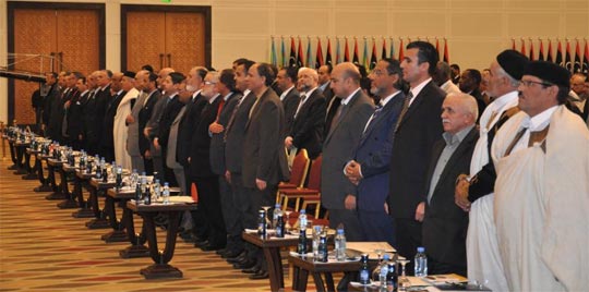 La tribune réservé aux interventions lors du forum est encadrée par deux drapeaux ; un libyen et un amazigh. Sur les côtés aussi étaient déployés des drapeaux amazighs et libyens. C’est dans ce décor que l’ensemble des intervenants ont pris la parole après avoir écouté l’hymne national libyen en arabe et en tamazight. Parmi eux, le président du Congrès général national libyen, Mohamed Maqrif, qui s’est déclaré favorable à l’officialisation et la reconnaissance de Tamazight dans la Constitution libyenne ; position qu’il a eu déjà à exprimer en novembre 2012 à Jadu à l’occasion du Festival Tafsut. Des membres du gouvernement, des représentants de nombre de partis politiques libyens se sont succédé à la tribune pour s’exprimer au sujet des droits constitutionnels des Imazighen de Libye.