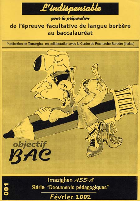Il faut rappeler que Tamazgha, en collaboration avec le CRB, diffuse, depuis 1995, un document permettant aux candidats à l’épreuve de s’y préparer. Petit à petit ce document a pris la forme d’annales de l’épreuve de berbère facultative de berbère au baccalauréat. Sous sa forme actuelle, mise à jour en 2002, il est intitulé "L’indispensable pour la préparation de l’épreuve facultative de langue berbère au baccalauréat. Objectif BAC". Ce document est disponible au siège de Tamazgha et il est d’une grande utilité pour les candidats qui pourront se le procurer.