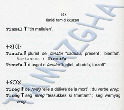 Dans la partie ″dictionnaire″, les prénoms sont, dans leur forme berbère, écrits en caractère tifinagh, puis écrits dans leur forme française suivie de le la lettre indiquant le sexe (F pour féminin et M pour masculin) suivis d’un commentaire en français. Enfin le prénom berbère transcrit en caractères greco-latins suivi de la lettre indiquant le sexe en berbère (T pour féminin et A pour masculin) suivi d’un commentaire en kabyle.