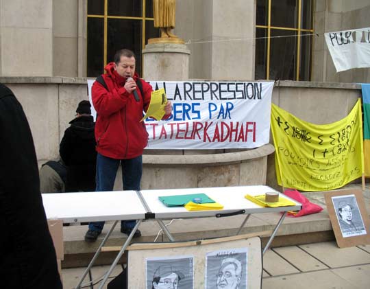 Lahoussaine Outachfit, Président de Tamaynut-France (Clichy), dénonce la politique anti-amazighe de Kadhafai, une politique négatrice de la démocratie également. Il a tenu a noté les déclaration farfelues de Kadhafi qui se permet de diffuser des informations mensongères sur l’Histoire des Imazighen, tout cela dans le but de nuire aux Imazighen. Il réitère la solidarité de son association avec l’ensemble des Imazighen, à travers Tamazgha, qui souffrent au quotidien des injustices que leur font subir les États en place en Afrique du Nord.