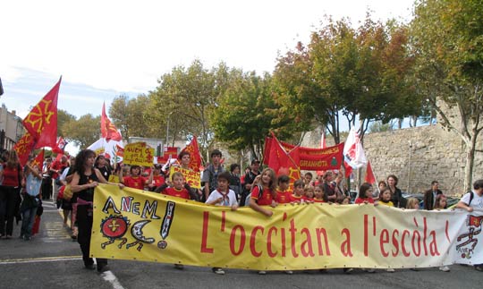 La "Coordinacion Anem Òc !", composée de plusieurs organisations (Institut d’Estudis Occitans [1], F.E.L.C.O. [2], Calandreta [3], Òc-Bi [4] et Felibrige [5]) a appelé à une manifestation le 24 octobre, à Carcassonne, pour demander la reconnaissance de la langue occitane et une prise en charge plus conséquente de cette langue par l’Etat français. La manifestation a été un véritable succès dans la mesure où l’essentiel des forces vives de la mouvance occitane ont répondu à l’appel, et près de 25.000 personnes ont convergé vers la cité occitane de Carcassonne ce samedi 24 octobre.