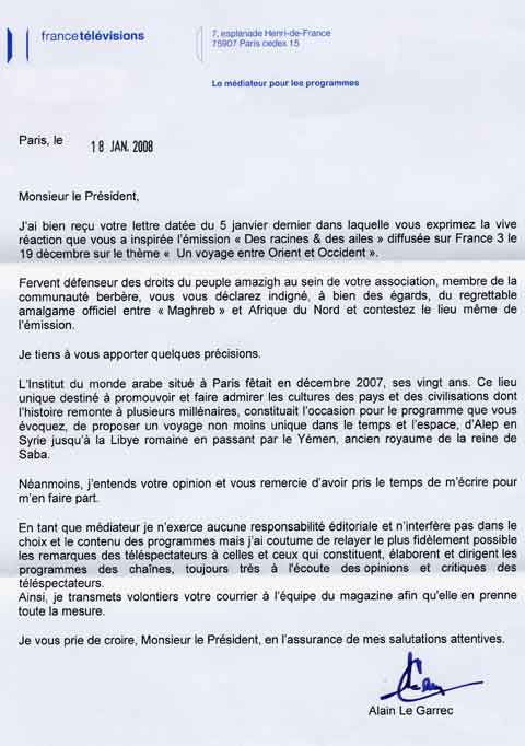 Suite à la lettre adressée par Tamazgha à France 3 suite à l’émission "Des racines & des ailes" diffusée le 19 décembre 2007, le médiateur pour les programmes de France Télévisions, Alain Le Garrec, a répondu à Tamazgha en apportant quelques précisions quant la dite émission. Il dit avoir tra,smis la lettre de Tamazgha à l’équipe du magazine.