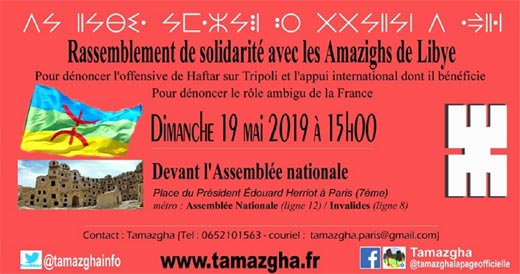 Rassemblement de solidarité avec les Amazighs de Libye, le dimanche 19 mai 2019 à 15h devant l’Assemblée nationale à Paris.