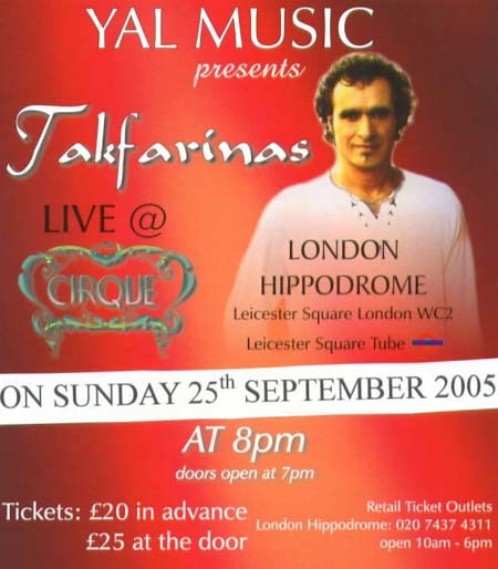 Takfarinas se produira en concert à Londres le dimanche 25 septembre 2005 à 20H00 au London Hyppodrom (Leicester Square London WC2 Leicester Square Tube).