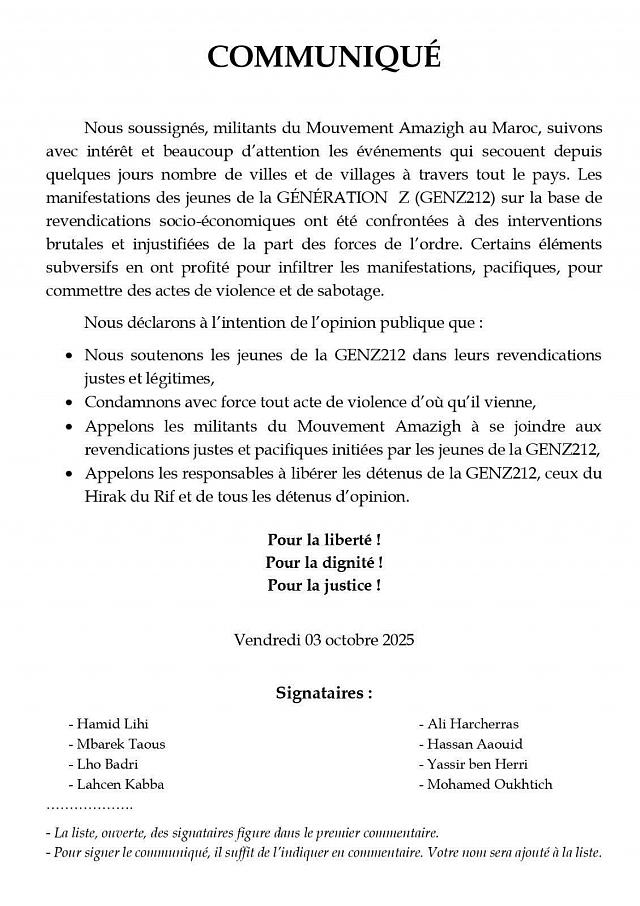 Nous saluons les militants du Mouvement amazigh qui, dans un communiqué en date du 3 octobre 2025, expriment leur soutien aux « jeunes de la GENZ212 dans leurs revendications légitimes » et appellent les militants du Mouvement amazigh à les soutenir et à se joindre à leurs « revendications justes et pacifiques ».